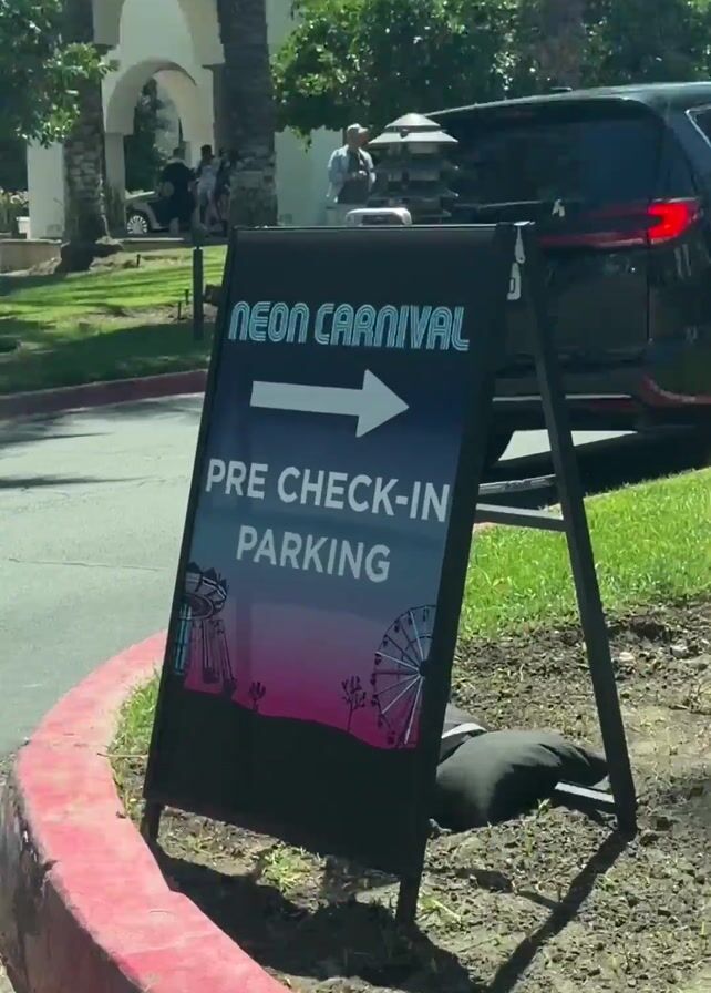 black sign for "Neon Carnival Pre Check-in Parking" with a white arrow pointing right