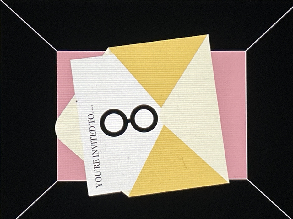 The image displays a two-dimensional graphic design featuring an invitation theme on a black background. It does not depict a physical location in Vancouver, Canada, or any other city. Centrally positioned, a pink rectangular card serves as a base for a partially open, off-white and yellow envelope. A white invitation card is visible, partially extracted from the envelope. The white card displays the black text "YOU'RE INVITED TO...." above a large, black, stylized digit "8" (or two vertically stacked circles). Thin white diagonal lines extend from each corner of the black background, framing the central paper elements. No people, discernible actions, or interactions are present. The environment is an abstract, static composition.