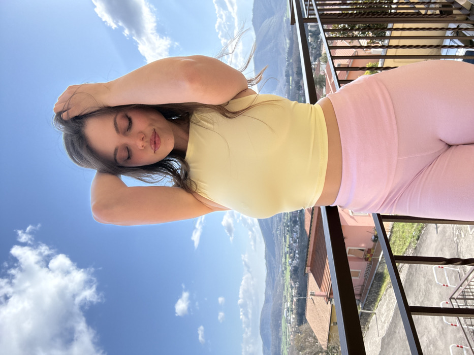 The image displays a female individual positioned on an outdoor balcony in Fiuggi, Italy. She stands centrally, with both arms raised, her hands resting in her long, wavy brown hair. Her eyes are closed, and her facial expression is serene with a slight smile. She is wearing a light yellow, sleeveless crop top and light pink, form-fitting leggings, which exhibit anatomical contouring in the groin area. The background reveals a panoramic view of Fiuggi and its surrounding landscape under a bright blue sky with scattered white clouds. Distant hills and mountains are visible, along with a valley containing residential buildings featuring terracotta roofs and patches of greenery. A dark metal railing forms the immediate foreground element of the balcony. The scene is brightly illuminated by natural light.