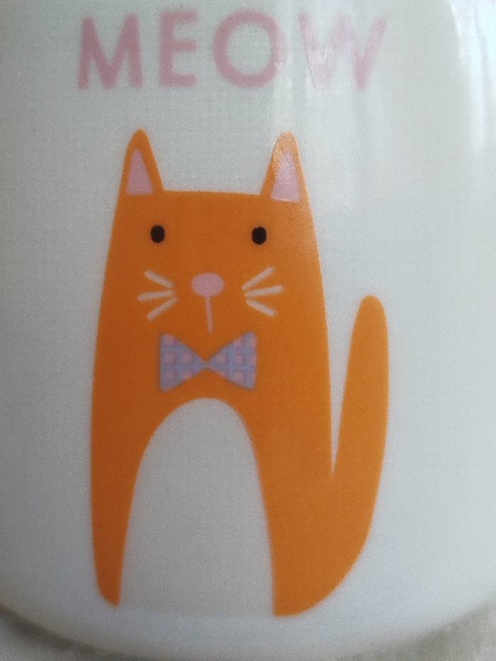 Location: Gabrovo, Bulgaria. The image presents a close-up view of a white, subtly curved surface, indicative of a ceramic mug or similar object. Dominating the frame is a two-dimensional graphic illustration of a stylized orange cat. This cat features a simplified, rounded body with two pointed ears, each containing a pink inner detail. Its face includes two small, round black eyes, a tiny pink triangular nose, and three short white whiskers extending horizontally from both sides of the nose. Positioned below the cat's head is a bow tie, patterned with light blue and faint pink squares. Above the cat, the word "MEOW" is printed in solid pink, uppercase block letters. The background is uniformly white and devoid of any additional elements or discernible environmental context. No people, actions, or interactions are visible.