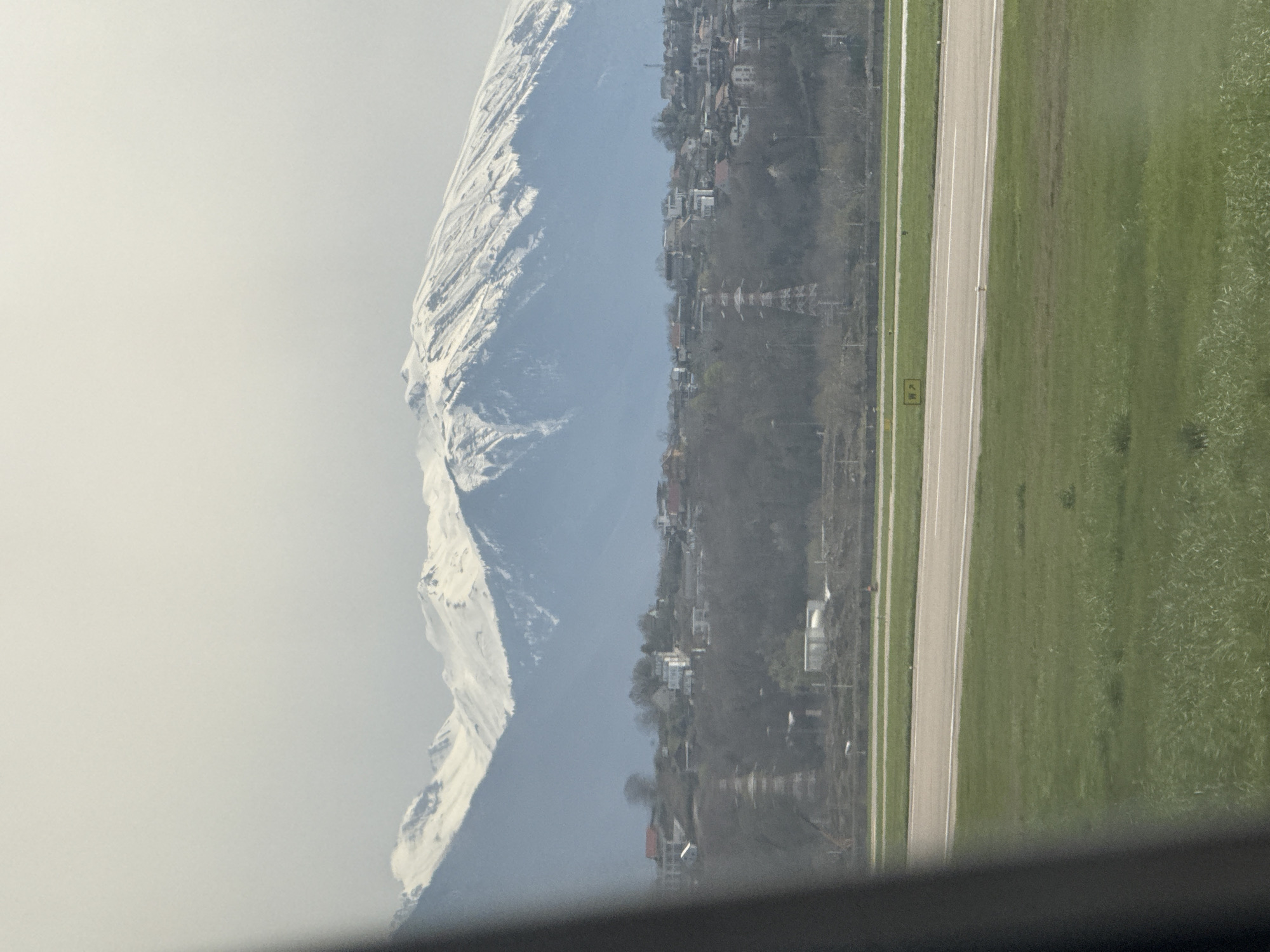 From a high vantage point, possibly an airplane window, the image depicts a view of Sochi, Russia. A snow-capped mountain dominates the left side of the frame, contrasting with the city below. A residential area with buildings and trees is visible along a hillside. An airport runway extends into the right side of the image, bordered by grassy fields. No people are directly observable in the frame. The general environment is a mix of natural (mountains, greenery) and urban (buildings, runway) elements, suggesting the location is near or within a city close to mountainous terrain.