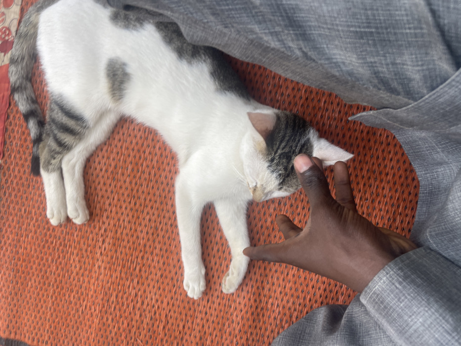 An overhead photograph captures a domestic scene in Akwanga, Nigeria. A calico cat, predominantly white with grey-brown tabby markings on its back, tail, and head, lies stretched on its back on an orange-brown woven mat. Its eyes appear closed. A dark-skinned human left hand, partially visible in the lower-left foreground, extends its index finger towards the cat's chin or lower face, seemingly in interaction with the animal. Portions of a human's legs, clad in light grey fabric, frame the scene on the left and right sides.
