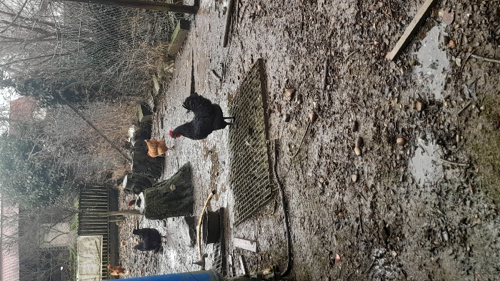The scene depicts an outdoor chicken enclosure in Meistratzheim, France, under an overcast sky