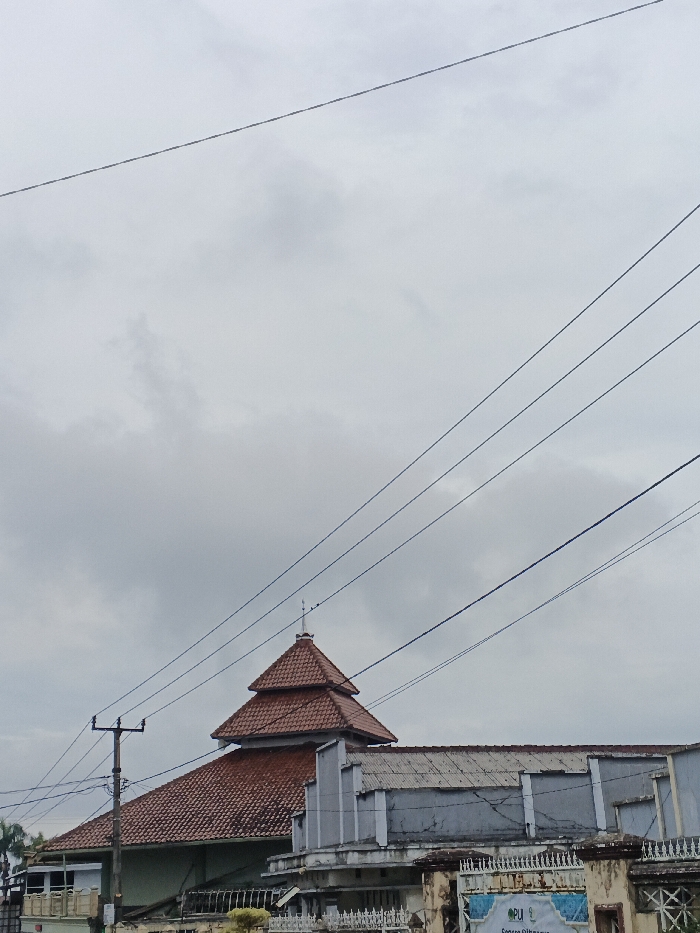 The image depicts an outdoor scene featuring multiple buildings and overhead utility lines under an overcast sky. The primary structure, positioned slightly left of center, is a building with a tiered, brown-tiled roof, topped by a small, pointed finial, consistent with the architectural style of a mosque or Musalla often found in Southeast Asia. To the immediate right, an adjacent light grey building with a corrugated metal roof is visible, showing signs of wear. In the foreground, a low, light-colored fence with decorative metalwork and a gate partially obscure the lower portions of the buildings. A white banner displaying blue text, including "OPI" or "PUI" and partially visible Indonesian words like "Santana" or "Silaturahmi," is attached to the fence or gate on the right. A dark utility pole with several black electrical or communication wires extends into the scene from the left, with these wires traversing diagonally across the grey sky. Green foliage from trees or bushes is visible on the far left. No people, specific actions, or interactions are discernible. The architectural styles and banner text indicate a location in Southeast Asia, likely Indonesia, which contradicts the provided location of Шчыткавіцкі сельскі Савет, Belarus.