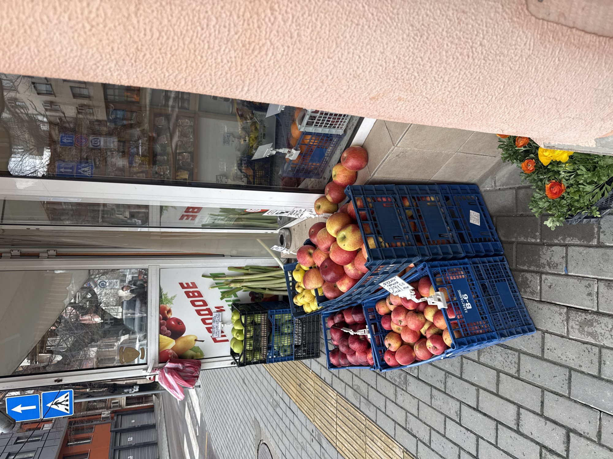A street-level view, shot at an oblique angle, shows a fruit and vegetable stand outside a shop in Varna, Bulgaria. Several blue plastic crates filled with apples are stacked on the gray brick pavement, some spilling out onto the sidewalk. Additional crates contain green pears and leeks. The shop's window and storefront are visible, with a sign in Bulgarian featuring fruits and vegetables. A pedestrian crosswalk sign is affixed to the building. Flowers in orange and yellow hues sit near the store front on the sidewalk. The facade of the building is peach-colored.