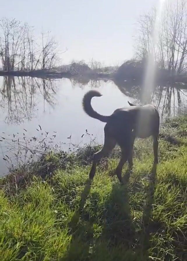 - "A brown dog with a curled tail walks towards the edge of a pond on a sunny day" by FM-IAa4I3, licensed under CC BY 4.0