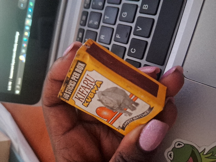 In Muthambi ward, Kenya, a close-up photograph depicts a dark-skinned hand holding a yellow "KIFARU KUBWA" brand matchbox, labeled "60 STICKS PER BOX" and "SAFETY MATCHES," featuring a grey rhinoceros illustration