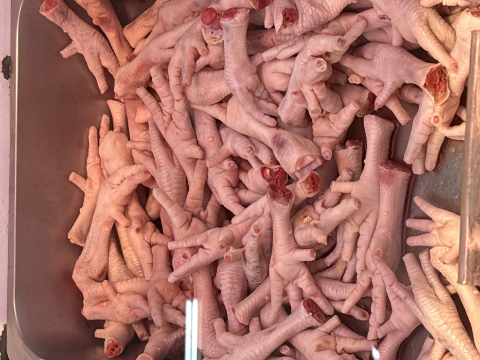 - "Hundreds of raw, skinned chicken feet are densely piled within a metallic, likely stainless steel, display container, filling the majority of the frame" by FM-paSbB2, licensed under CC BY 4.0