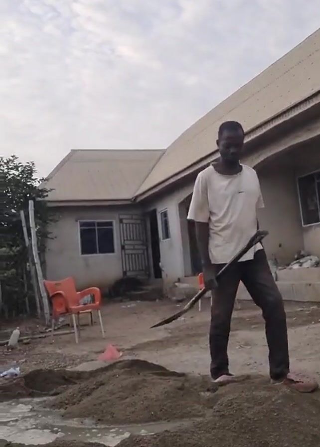 man standing in a dusty yard, holding a digging tool with a long handle and a flat, curved blade. He is wearing a light-colored t-shirt, dark pants, and casual sandals. He uses the tool to dig into a pile of sand and mix it with water. In the background is a single-story house with a light-colored roof and several windows. An orange plastic chair sits near the house. Other objects around the yard include buckets and building materials. The sky is overcast.