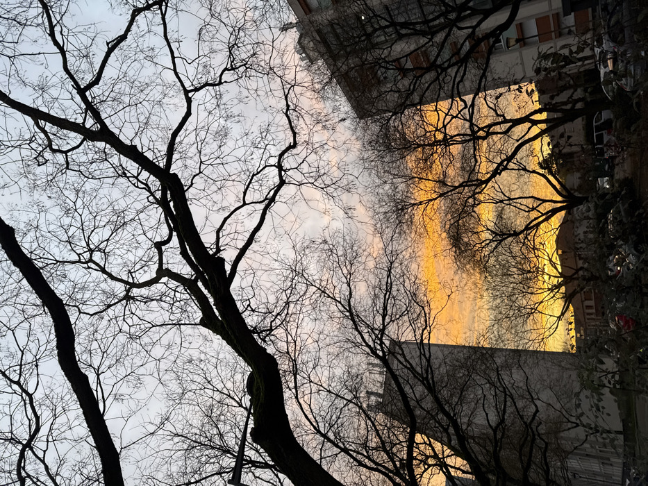The image depicts an urban landscape at either sunrise or sunset, characterized by a prominent golden-orange glow on the horizon, situated in the Esplanade district of Strasbourg, France. The foreground is dominated by a dense, intricate network of silhouetted bare tree branches, indicating an autumn or winter season. On the left, a tall, light-colored, multi-story residential building, consistent with the architecture of towers found in Strasbourg's Esplanade district, rises into the frame. Its flat roof features several distinct vertical rectangular structures. To the right, another multi-story residential building, partially obscured by tree branches, exhibits a darker facade with visible windows. Below the horizon's intense glow, outlines of smaller buildings and additional leafless trees are visible. The lower portion of the image shows dark, indistinct vegetation, likely bushes, and several parked vehicles, suggesting a street or parking area at ground level. The sky above the orange glow transitions to an overcast grey. No individuals or specific human activities are discernible within the scene.