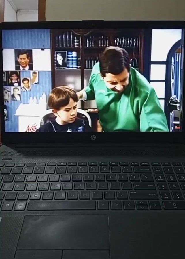 laptop displaying a scene with a man and a boy. The man, wearing a green barber's smock, holds hair clippers to the boy’s head. The boy sits in a chair with a concerned expression. The background includes a bookshelf and framed photos on the wall. The screen briefly shows the back of the boy's head with a bald spot. The laptop is black and sits on a neutral surface.