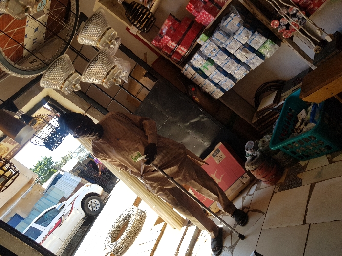 An elderly African male stands within an electrical or hardware shop, facing the viewer