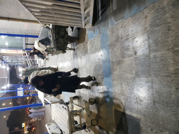 The scene depicts an outdoor hospital entrance or triage area at night in Kandahar, Afghanistan. The foreground shows a tiled concrete ground with a prominent blue strip running horizontally. To the left, an empty white wheeled hospital gurney with a textured mattress is positioned. In the center-foreground, a person wearing a dark long coat and light pants, with their back partially to the camera, walks towards the viewer. Behind them, another individual in light-colored traditional attire, including a long shawl, stands. Further right, a person is seated on a dark, wheeled utility cart or makeshift stretcher, partially obscured by a white slatted barrier on the extreme right. Additional individuals in traditional Afghan clothing are visible standing and sitting along a wall or building facade with windows and a metal railing. In the background, on the far left, a street is visible with vehicle lights and several figures, some appearing to wear burqas. Overhead artificial lighting illuminates the immediate area, while the background appears darker with distant streetlights. Blue structural columns are visible, supporting an overhead canopy or extended structure.