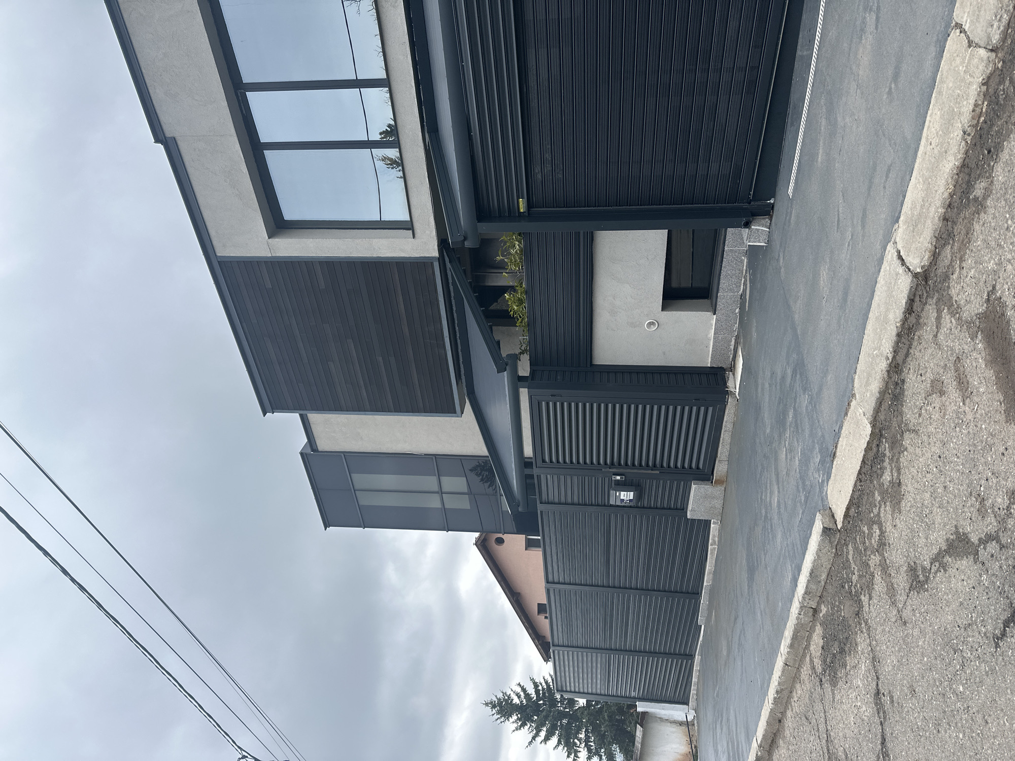 modern house in Lozen, Bulgaria. The building features a contemporary design with a combination of materials including concrete, wood, and glass. There are large windows reflecting the sky. A black metal fence and gate surround the property. The foreground consists of a sidewalk and a paved road. The sky is overcast. Utility lines are visible in the upper left corner. A tree stands near the fence.