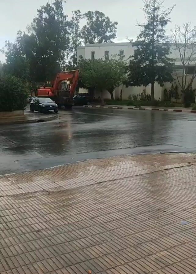 rainy scene with a large orange excavator stopped on a wet asphalt road. A black car is parked nearby. In the background, there are trees and a white building. A person in a gray robe walks along the side of the road. The foreground is a paved area with a brick pattern.