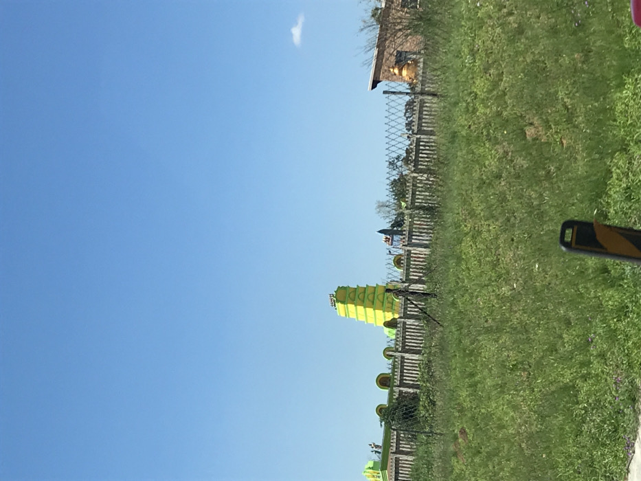 A vibrant green grassy field stretches under a clear blue sky. A wooden fence runs across the field, partially obscured by the grass. A tall, multi-tiered yellow structure, potentially a decorative tower, rises from behind the fence. A building with a tan facade is visible in the background. A small white cloud floats in the sky. A sign with yellow stripes is partly visible in the lower right.