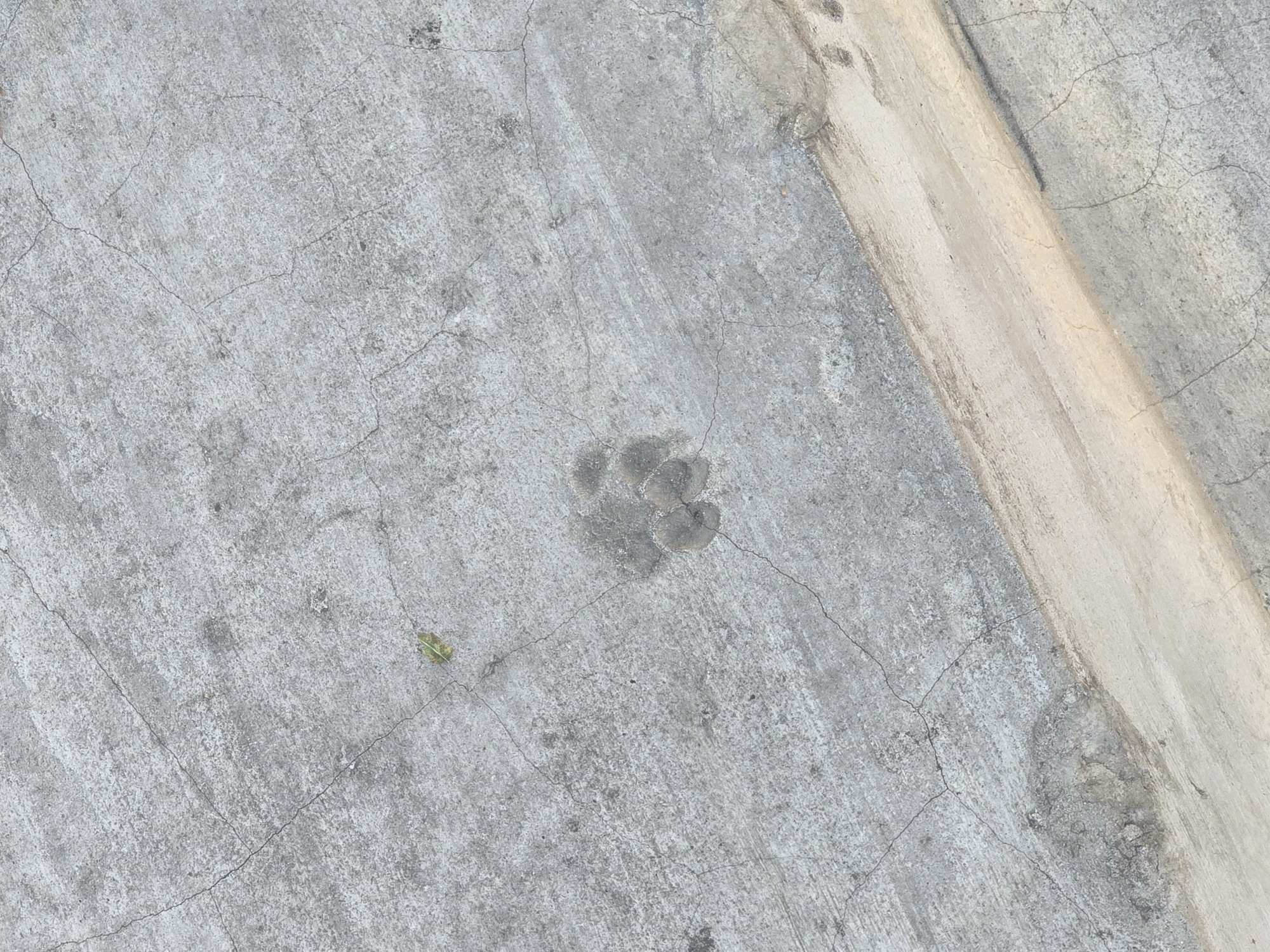The scene depicts an overhead forensic view of a grey concrete surface located in the city of Suthep, Thailand. A single, dark grey canid paw print, approximately 7 cm in diameter, is permanently impressed into the concrete slightly above the frame's center. This impression indicates the paw contacted the surface while the concrete was in a plastic state. The concrete slab exhibits a network of fine to medium-width cracks across its entirety. A small, desiccated, greenish-brown leaf fragment is present on the concrete in the upper-left quadrant. The lower-right portion of the surface features a distinct, diagonally oriented band of lighter, sandy-beige material or discolored concrete, approximately 10-15 cm wide, running from the mid-right edge to the bottom-center. Minor scattered debris and subtle variations in surface texture are also visible. No individuals or active subjects are present.