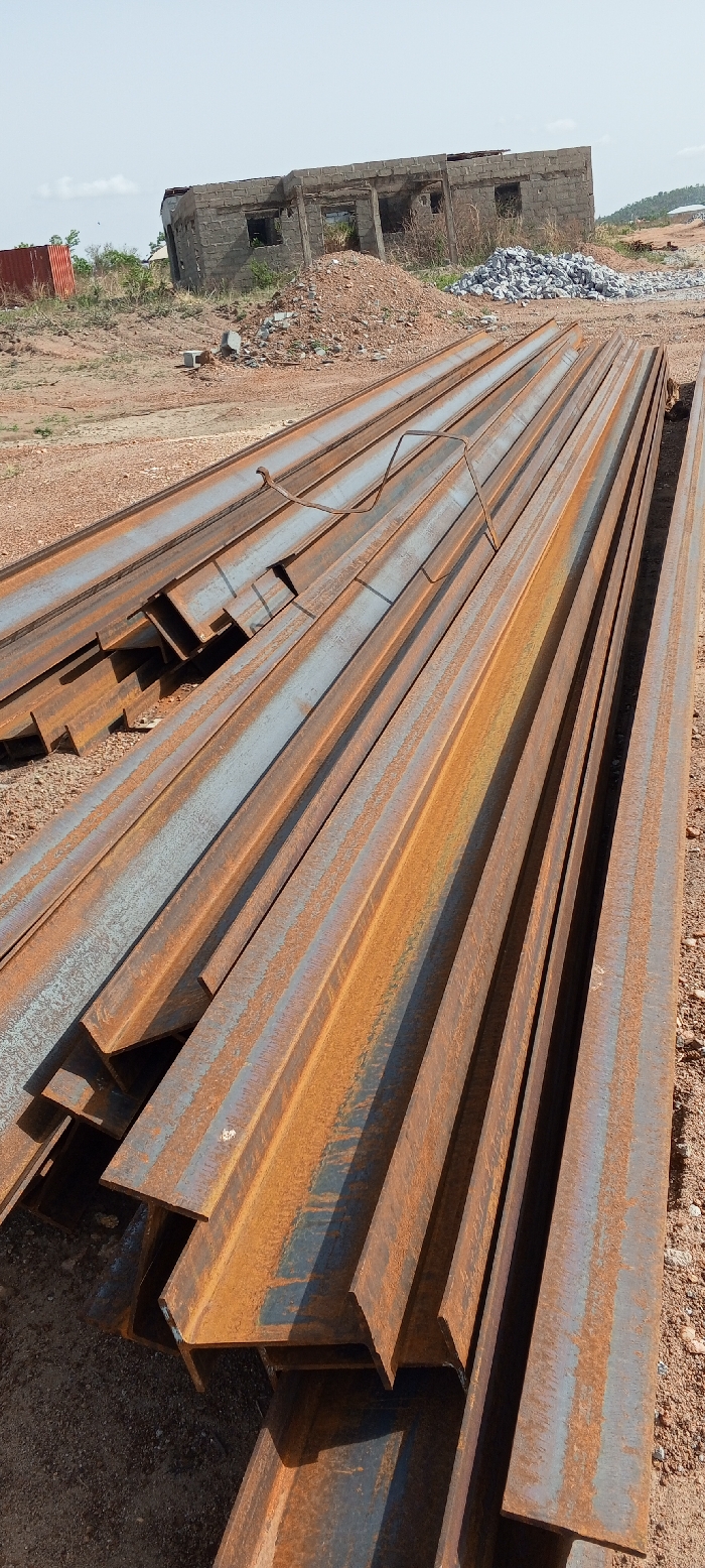 stack of rusty steel I-beams lying on reddish-brown soil. In the background, there is a partially constructed building with visible blockwork and openings. To the left of the building, there is a red shipping container and some sparse vegetation. The sky is light blue, and the environment appears to be a construction site or storage yard. The location is in the city of Unknown, Unknown.