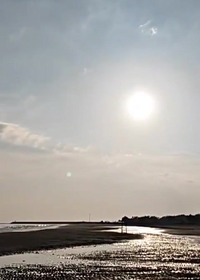 beach scene with the sun high in the sky. The beach is wide and appears sandy with shallow pools of water reflecting the sunlight, creating a shimmering effect. On the right side of the frame, there is vegetation. The sea is calm with small waves breaking on the shore in the distance. The sky is a pale blue with scattered clouds. The overall tone is peaceful and serene.