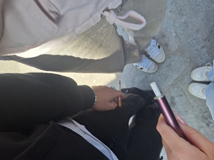 The scene captures a downward view of three individuals standing on a light-colored paved surface in Stara Zagora, Bulgaria. In the immediate foreground, a person's right hand, featuring light-colored manicured fingernails, holds a purple electronic tobacco heating device with a white tobacco stick inserted. Below this hand, the person's light blue jeans and white sneakers are visible. To the left, another individual, wearing a black long-sleeved top and dark pants, holds a lit traditional cigarette in their right hand; a silver-colored bracelet is present on their wrist. To the right, the lower body of a third individual is partially visible, wearing light-colored trousers and white sneakers with black stripes. The ground shows texture consistent with concrete or stone, and shadows indicate an overhead light source.