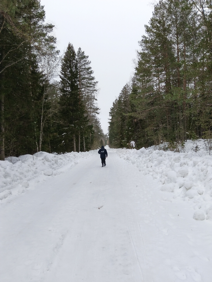The scene depicts a snow-covered forest path in Красный Маяк, Russia, under an overcast sky. Tall coniferous and some deciduous trees form dense forest on both sides of the path, receding into the distance. The path itself is covered with compacted snow, displaying faint parallel tracks, potentially from a vehicle or skis. Irregular snow banks line the edges of the path, more prominent on the right side. A single individual, dressed in a dark hooded jacket and dark trousers, is observed from behind, walking away from the camera directly down the center of the path. No other actions or interactions are visible. The lighting is flat and diffused, typical of an overcast winter day.