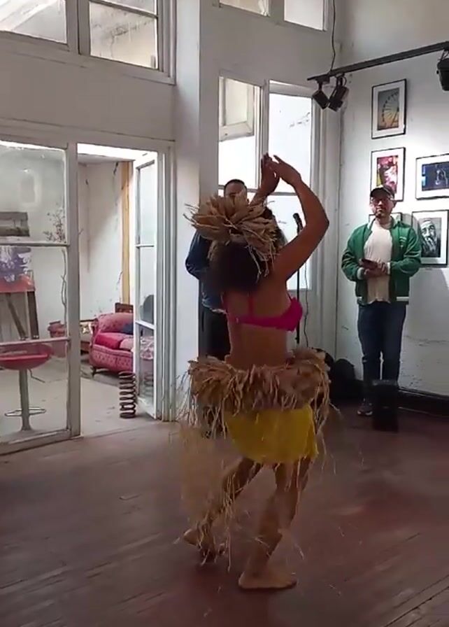 woman dancing in what appears to be an art gallery. The woman is wearing a pink top, yellow skirt, and a headdress made of straw or similar material. She is performing a dance that involves swaying and moving her arms. There are two men watching her. One man is standing near her with his arms raised, possibly providing music or rhythm, and the other is standing against the wall with his hands in his pockets. The room has light-colored walls, a wooden floor, and several windows. There are pictures hanging on the wall and a door leading to another room containing a red couch. There is a microphone stand near the woman, suggesting the performance may be amplified.