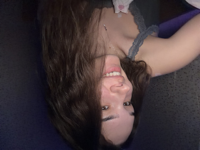 The image displays a young adult female in an indoor, low-light setting