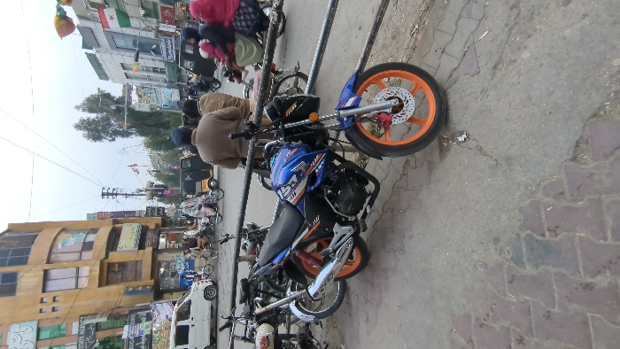 The image depicts a street scene in Quetta City Tehsil, Pakistan, under an overcast sky. In the foreground, a blue Honda 150cc motorcycle is parked, facing right, leaning on a kickstand. It features orange five-spoke alloy wheels, a front disc brake, and a silver exhaust system. The motorcycle is positioned in front of a horizontal black metal barrier that spans the mid-ground. The ground consists of grey concrete paving stones with visible cracks and minor debris. Behind the barrier, a paved street accommodates a mix of vehicular and pedestrian traffic. Multiple motorcycles are in motion or parked. Several three-wheeled auto-rickshaws, primarily black with one yellow, are visible. A white van is parked on the left side of the street. Individuals are present: one man in a light brown jacket and dark cap is seen from behind, standing near the barrier. Other people, including women wearing head coverings, are riding motorcycles. The background is defined by multi-story commercial buildings. On the left, a tan-colored building displays various signs, including "STATE AGENCY" and "MEDICAL." On the right, a lighter-colored building, appearing more modern, features flags and banners, notably a green, white, and red flag with a yellow star. Overhead, numerous electrical wires are strung across utility poles. Trees are visible in the distant background.