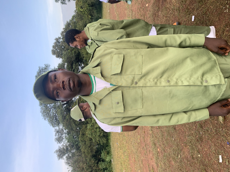 The image captures an outdoor scene within the city of Kubi A, Nigeria, featuring an open field environment. In the foreground, a young adult male of African descent, estimated to be between 20 and 30 years old, stands facing the viewer with a neutral expression. He is dressed in a light olive-green long-sleeved uniform shirt featuring two chest pockets and shoulder epaulets, paired with a matching baseball cap. A white t-shirt with green and white striped trim is visible underneath the uniform shirt. In the mid-ground, to the subject's left, another male is partially visible from behind, wearing a white t-shirt and a similar olive-green cap. To the subject's right, a third male stands facing right, wearing a full light olive-green uniform, including a long-sleeved shirt, trousers, a white undershirt, and white athletic shoes. A fourth individual is partially visible at the far right edge. The uniforms worn by the individuals are consistent with those utilized by participants in Nigeria's National Youth Service Corps (NYSC) program. The ground beneath the subjects is a reddish-brown dirt surface, interspersed with patches of sparse green grass and small pieces of white debris. The background is dominated by a dense line of various green trees and foliage, situated beneath a clear, light-blue sky, indicating a daytime setting.