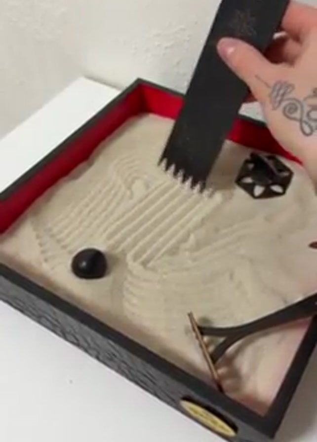 A person's tattooed hand holds and manipulates a toothed rake in a small zen garden. The rake is black and features a small hole and lotus-like design at the top. The zen garden has a black, rectangular frame with a red interior lining, and is filled with light-colored sand. Inside the sand are various other objects, including a dark stone, a miniature bridge, and another black object. The person uses the rake to create linear patterns in the sand, drawing parallel lines. The background is a plain white surface, suggesting the garden is on a table or similar flat surface.