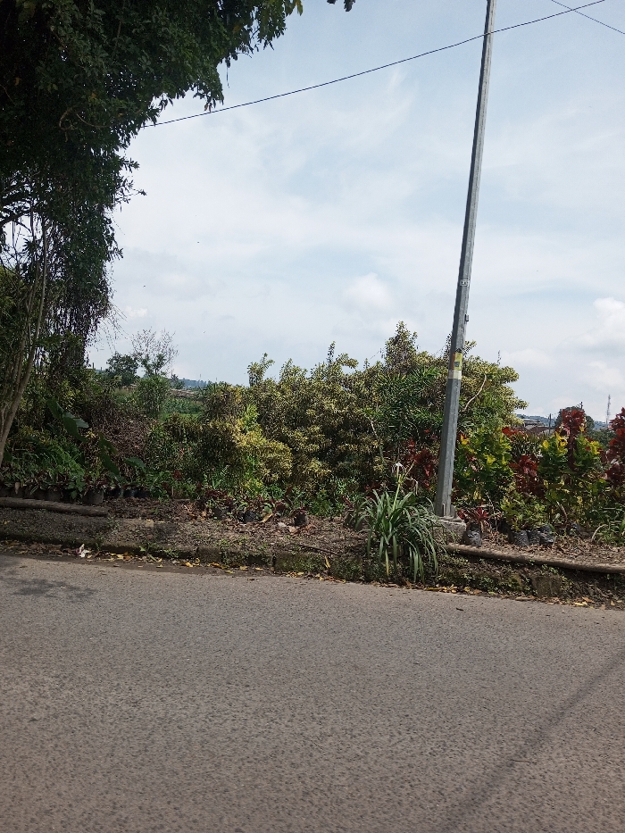 The scene depicts a roadside environment in Vieng Phouka, Laos, under natural daylight. The lower half of the image is dominated by a dark grey asphalt road with a textured, granular surface. Immediately adjacent to the road, a low, uneven earthen bank, approximately 15-20 cm high, is visible, covered with soil, scattered dry leaves, and minor organic debris. Beyond this bank, a dense line of varied vegetation extends across the midground. On the far left, the trunk and lower branches of a large tree with dark green foliage are partially visible, with its canopy extending into the upper left quadrant. To its right, a thick growth of shrubs and smaller plants displays a range of leaf colors, including dark green, variegated yellow-green, and some reddish-brown foliage. Numerous small dark plastic bags, consistent with nursery pots, are interspersed within this vegetation, particularly on the left and right sides. A cluster of green, strap-like leaves with a tall white flower stalk, possibly a Hymenocallis, is situated to the left of a utility pole. A grey utility pole stands vertically on the right side of the image, rising from the vegetation near the road. It features several horizontal markings. A single, dark-colored utility wire extends diagonally upwards from the upper right, originating near the top of the pole and disappearing off the left frame. The background reveals a landscape of further green foliage and what appears to be cultivated fields or distant terrain, extending towards a low horizon. The upper portion of the image displays a sky with patches of light blue and scattered white clouds. No individuals or animals are present, and no specific actions are depicted.