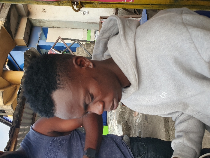 A person with dark skin and short black hair is wearing a gray hoodie with a small white logo on the front. The person is looking down and their eyes are closed. Another person is partially visible, wearing a blue shirt and a watch. The background includes a mix of building structures and outdoor elements like a corrugated metal roof. The photo is taken at an angle, with the subjects appearing tilted.