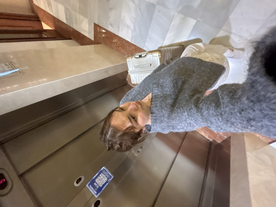 A person stands in an elevator holding luggage, wearing a gray sweater. The elevator's control panel, including a "scan" QR code, is visible. The elevator opens onto a landing with stairs and marble walls. The scene is slightly tilted, giving a disoriented perspective.