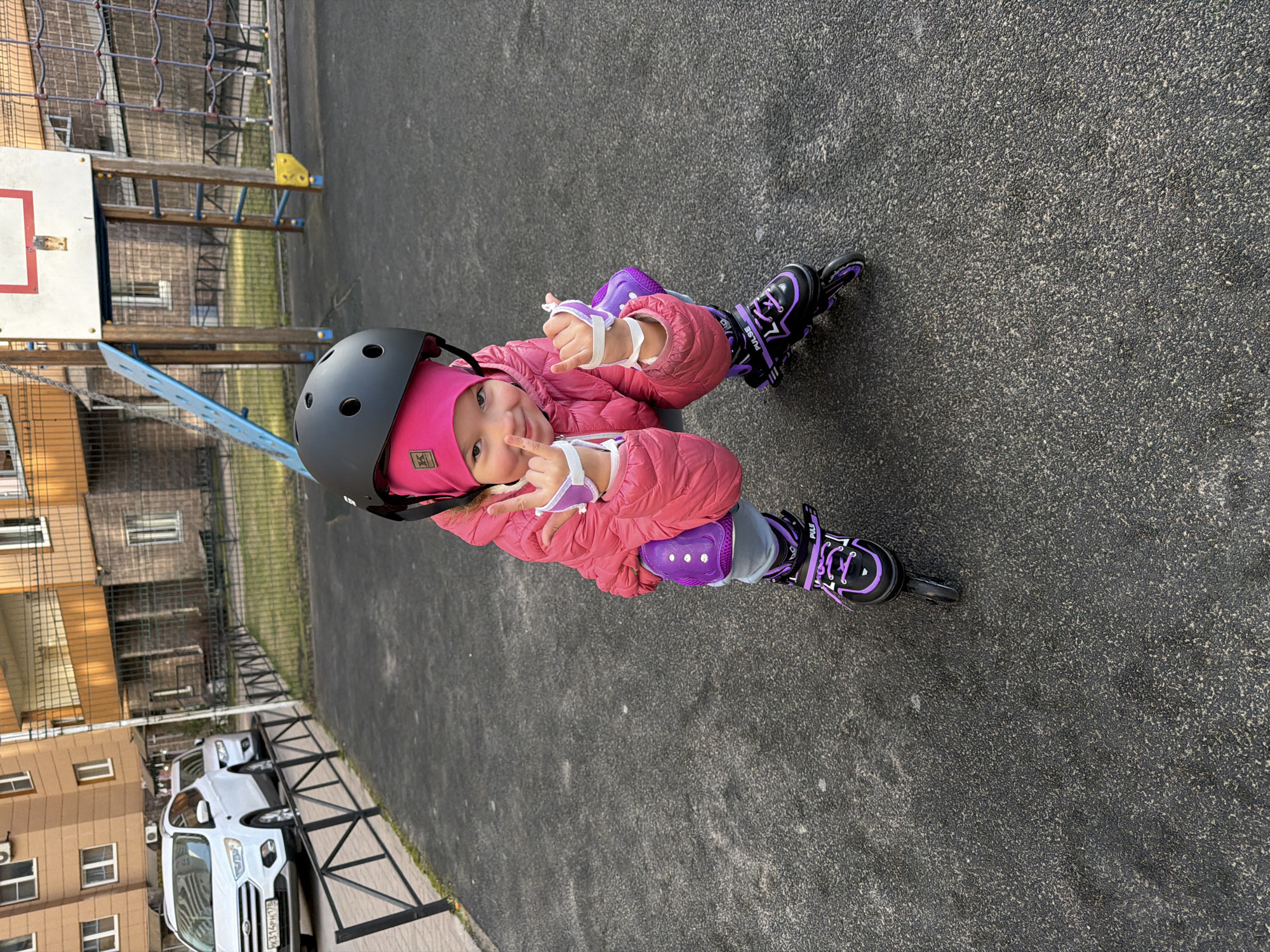 A young child, approximately 5-7 years old, is depicted crouching on a dark gray, textured playground surface in Murino, Russia. The child is wearing a black helmet over a bright pink beanie, a quilted pink jacket, light-colored pants, purple knee pads, white wrist guards, and black and purple "PULSE" brand inline rollerblades. Both hands are raised, forming "rock on" gestures, and the child smiles directly at the camera. In the background, a black metal fence separates the playground from a paved area where two white SUVs are parked. The visible license plate on the front SUV (a Ford Escape) displays "K314PH 178 RUS", confirming the Russian location (St. Petersburg region, adjacent to Murino). Behind the vehicles, a multi-story residential building with brown and beige siding is visible. To the right of the child, parts of a playground structure are present, including a wooden frame supporting a basketball backboard, a blue slide, and a climbing net. Another building with a brick facade is visible further in the background. The overall scene indicates an outdoor, urban residential setting on a clear day.