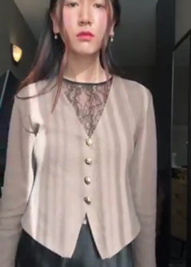 A young woman with long hair and pink blush poses in what appears to be a hotel room. She's wearing a black top with lace details under a light brown cardigan with gold buttons. She's also wearing a black skirt. The room is dimly lit and contains a mirror, a TV, and a wall lamp. She poses by putting her hands behind her back and then touching her neck.