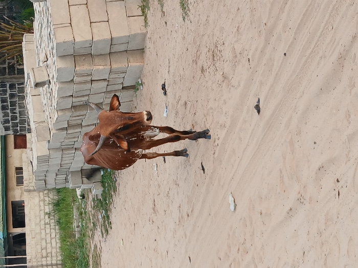 A light brown, horned cow stands on a sandy patch of ground. It is slender, with visible ribs and patches of white spots. Beside the cow is a large stack of square cement blocks, placed upon an area with some greenery. In the background, a building with gray walls, green trim, and windows is visible. The ground is uneven with scattered debris.