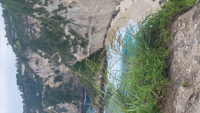 From a high vantage point, a coastal scene unfolds. A steep, rocky cliff face, partially covered in green vegetation, descends towards a sandy beach where waves gently meet the shore. The ocean's water displays a vibrant turquoise hue. In the foreground, a patch of dense green grass grows atop a rough, stony surface. The overall scene conveys a sense of natural beauty and the scale of the coastal landscape.