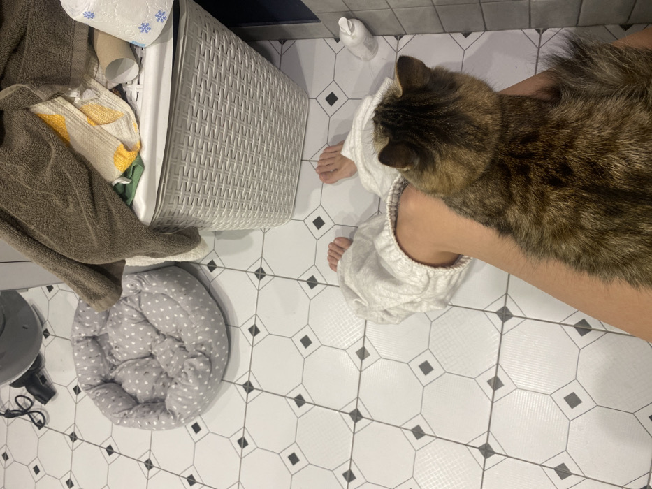A top-down shot shows a cat perched on someone's lap, their bare feet visible on the tiled floor