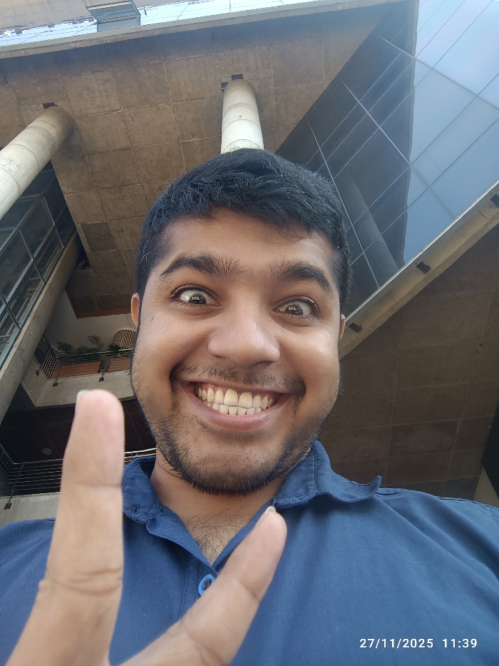 A man poses for a selfie outdoors, making a peace sign with his left hand and grinning widely. He wears a blue collared shirt. Behind him, architectural elements include concrete columns, overhangs, and a glass-paneled facade, creating an urban backdrop. The time stamp on the bottom right shows 27/11/2025 11:39.