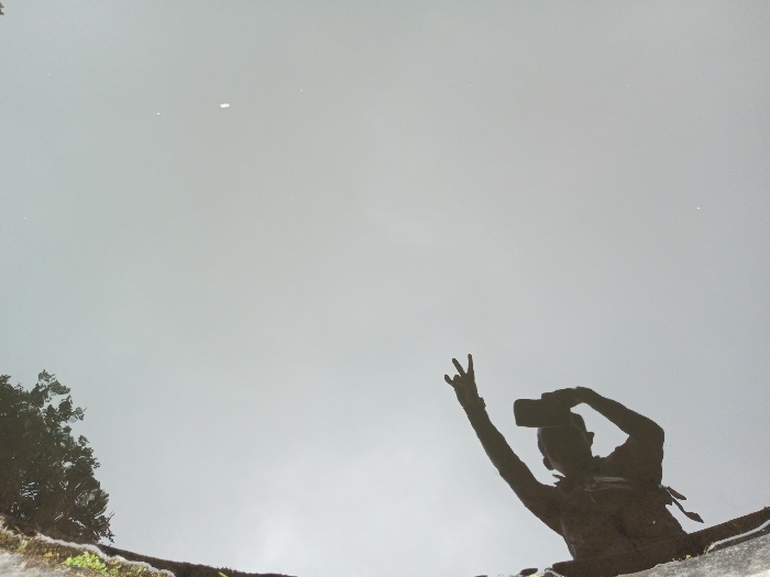 The image captures a unique perspective, likely a reflection in water, showing a silhouetted person holding a smartphone and making a peace sign