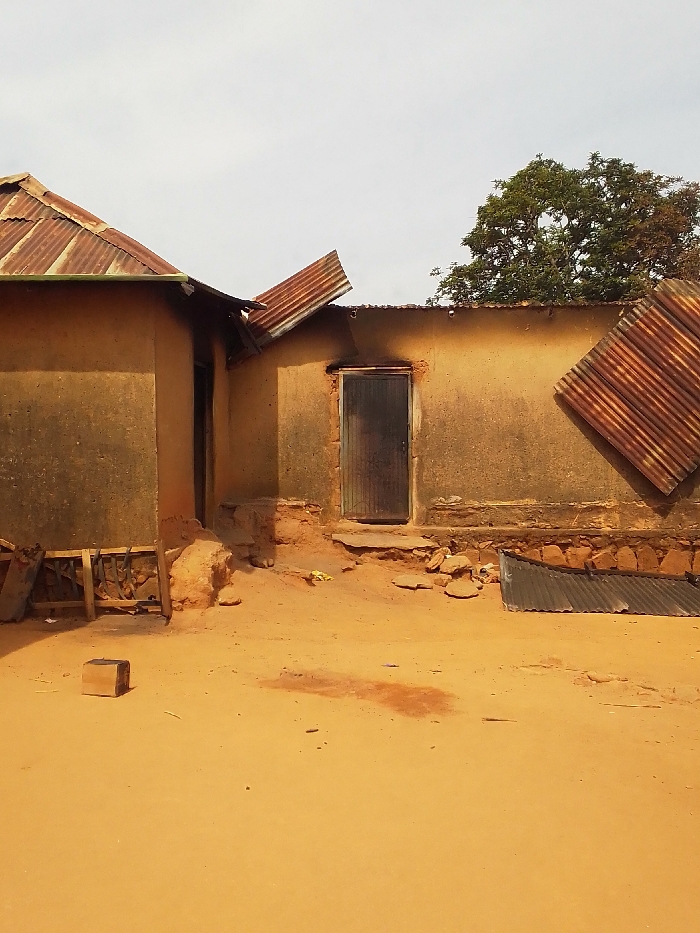 partially destroyed building in Kwal, Nigeria, located at latitude 9