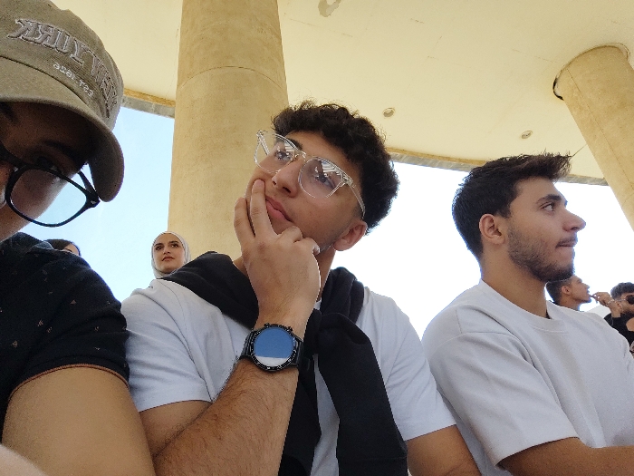 The image captures a casual gathering of several individuals, primarily young adults, in Jibb as-Safa, Syria. The scene is viewed from a low angle, under a light-colored architectural structure featuring large cylindrical pillars and a bright sky visible overhead. In the left foreground, a male is partially visible, wearing a beige baseball cap with "NEW YORK" text (reversed) and black-framed glasses, looking downwards towards the camera's perspective. His right arm, clad in a dark, speckled short-sleeved shirt, occupies the lower left corner. The central figure is a young adult male with dark curly hair and clear-framed glasses, wearing a white short-sleeved t-shirt and a black sweatshirt draped over his shoulders. He rests his right hand on his chin, appearing contemplative, and is looking upwards and to his left. A dark smartwatch with a blue and white circular display is prominent on his left wrist. To the right of the central figure, another young adult male is shown in profile, with dark hair and light facial hair, wearing a light-colored short-sleeved t-shirt. He is looking towards the right side of the frame. In the mid-ground, positioned between the leftmost and central male figures, a young adult female wearing a light-colored hijab is visible, looking generally forward. Further in the background, several indistinct figures are partially visible, including one on the far right wearing sunglasses. The bright natural lighting suggests an outdoor or semi-enclosed outdoor setting.