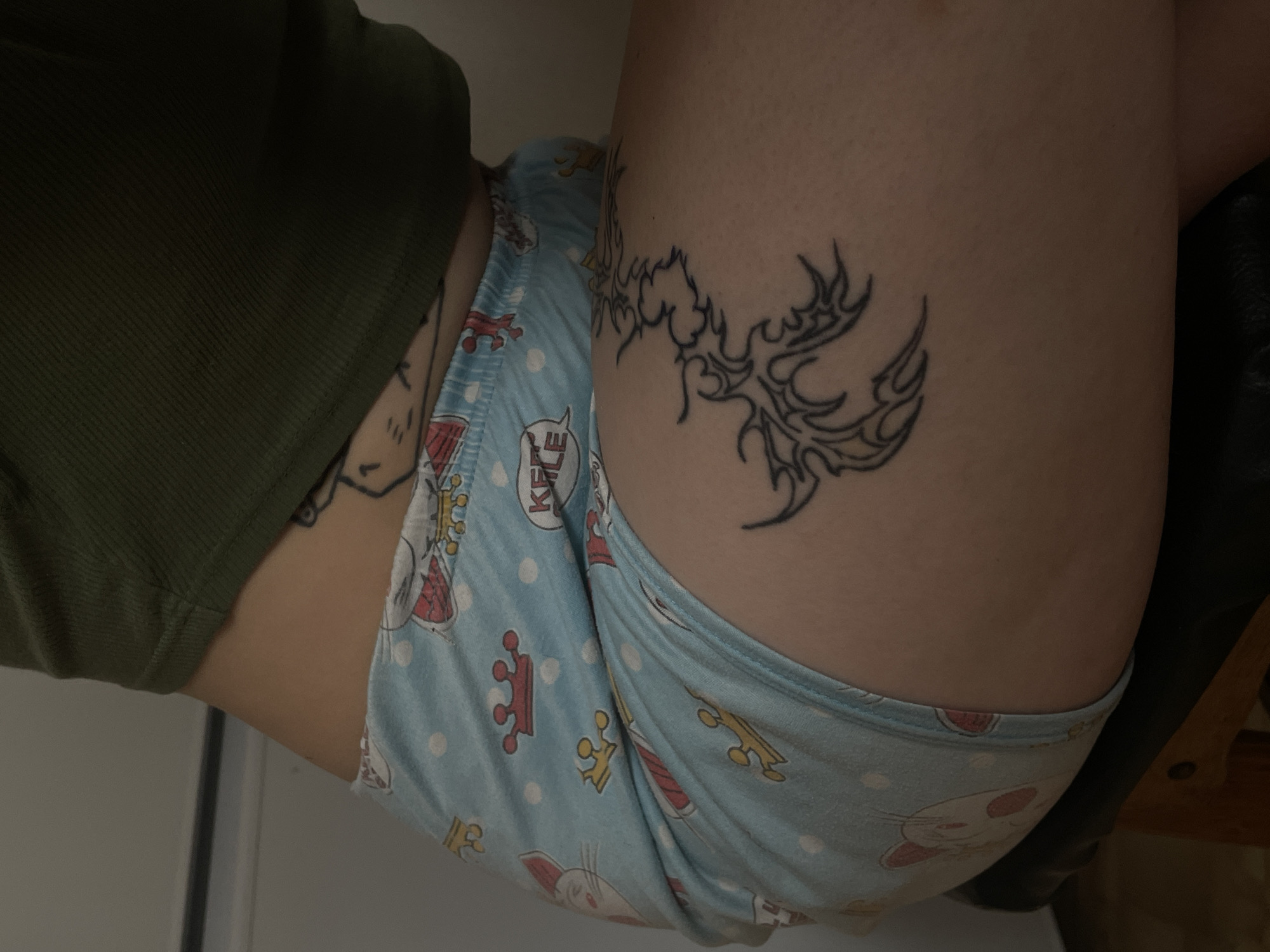 portion of a person's torso and upper thigh. They are wearing a dark green ribbed shirt and light blue underwear with a pattern of white polka dots, crowns, and cartoon cat faces. A tattoo of a stylized bird or abstract design is visible on their upper thigh. Another tattoo is partially visible on their side. The background is a plain off-white wall and a dark, possibly leather-covered, chair. There is no indication of the location of Марковский, Russia in the image.