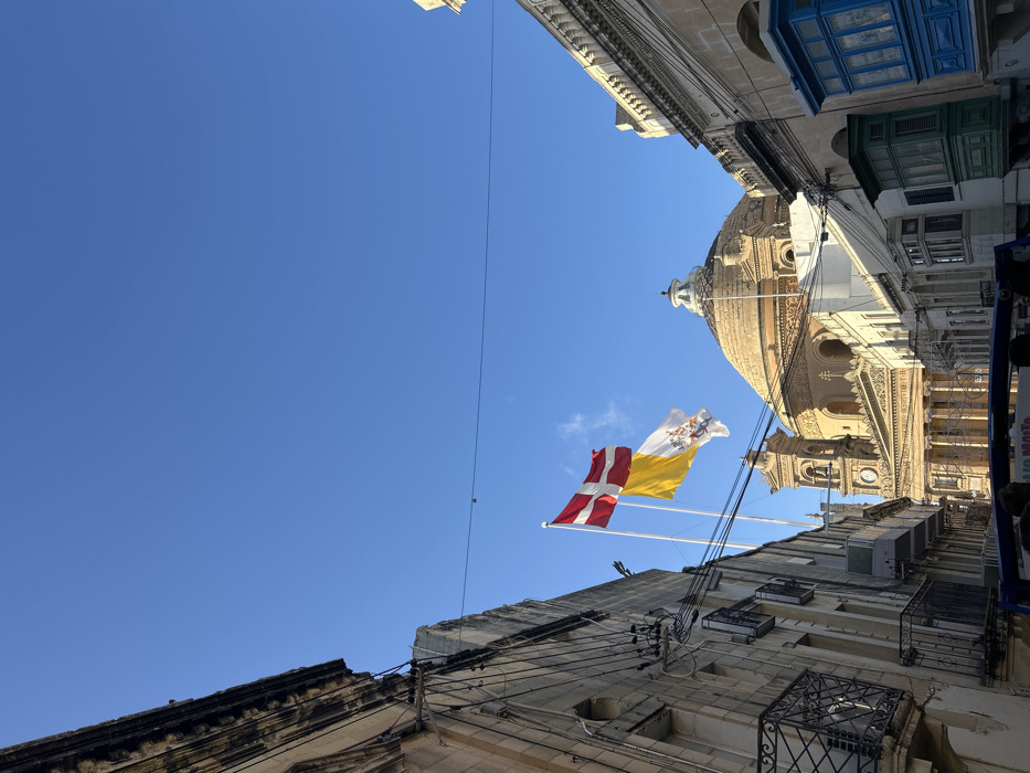 The image depicts a street scene in Mosta, Malta, under a clear blue sky, with the Rotunda of Mosta (Mosta Dome) as the central background element. The large, light-colored dome, topped with a smaller cupola, dominates the view. Its classical facade below features columns and a clock tower visible on the left. Two flags fly from poles positioned left of the dome: a red flag with a white cross (Order of Malta) above a yellow and white flag with a central crest (Vatican City). Buildings line both sides of the narrow street. The building on the left is multi-story, constructed of light-colored stone, with black metal balconies and visible external utility wiring. Buildings on the right exhibit similar stone construction, including traditional enclosed wooden balconies, one painted green and another blue. The upper portion of a blue open-top tour bus is visible at the bottom of the frame, containing the heads of several passengers. A single utility wire traverses the sky horizontally above the street. The scene is illuminated by direct sunlight.