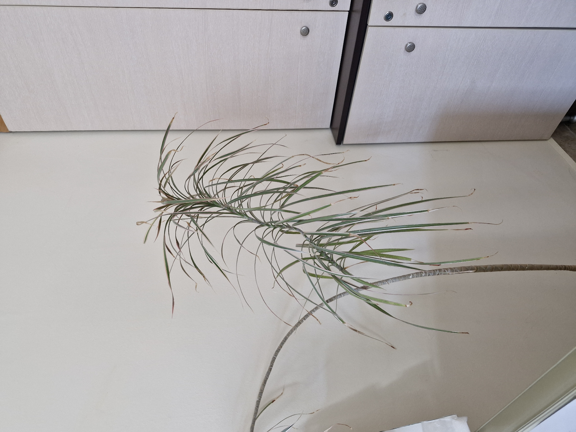 A wilting dracaena marginata plant lays horizontally on a light beige surface, likely a floor, positioned in front of built-in, light wood-grain cabinets with silver hardware. The leaves of the plant display both green and brown coloration, indicative of decline or improper care. The cabinets are situated on the upper portion of the frame, with the light surface occupying the lower portion. The location is unknown.