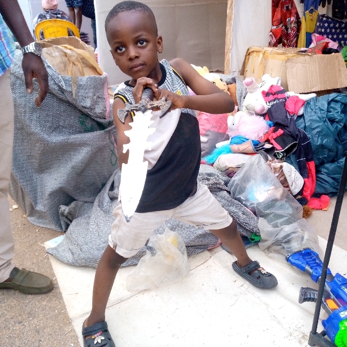A young boy, centered, holds a toy sword with a determined expression. He wears a black and white top, light shorts, and sandals. Surrounding him are large, stuffed sacks, toys, and miscellaneous items, suggesting a marketplace or storage area. An adult's arm and leg are visible to the left, partially cropped. The setting is outdoors, with a concrete or paved surface visible at the bottom.