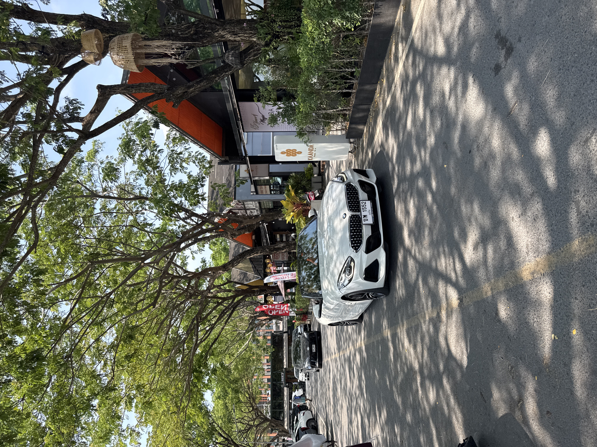A white BMW Z4 convertible, bearing license plate "บพ 1552", is positioned on a paved road in Choeng Thale, Thailand. The vehicle, with its top down, is oriented slightly towards the right foreground, exhibiting no visible occupants. The asphalt road features a faded yellow center line and is heavily shadowed by a dense canopy of trees overhead, creating a pattern of dappled light. To the left, a queue of parked vehicles, including a black SUV (license plate "ภภ 308") driving towards the viewer, occupies the road or adjacent parking area. A lone individual, dressed in a light-colored shirt and pants, walks on the left side further down the street. To the right, a series of modern commercial buildings with dark exteriors and distinctive orange-colored roof sections line the street, set back from the road by a sidewalk and a dense row of green hedges. A prominent white vertical sign displays the "KAANDA boutique home & cafe" logo in gold. Another sign indicates "15 Years of Magic". Large trees with extensive green foliage flank the street, and woven decorative lamps hang from branches near the buildings. The sky overhead is clear and blue, indicating a sunny day.