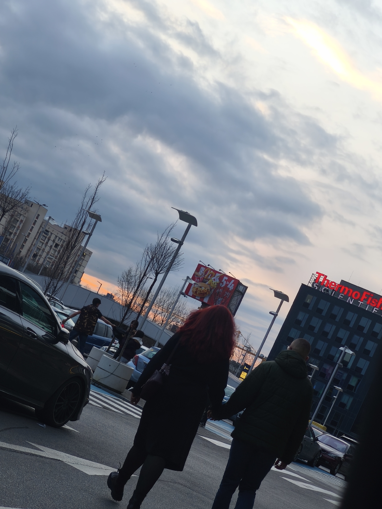 The image depicts an urban outdoor scene at dusk, characterized by an overcast sky with an orange-yellow sunset glow on the horizon. The location is Business Park Sofia, Mladost 4 district, Sofia, Bulgaria. In the foreground, two individuals, a female with red hair and a male, walk away from the viewer, holding hands. The female wears a dark coat, dark leggings, and boots, with a dark bag on her left side. The male wears a dark green hooded jacket and dark trousers. They are positioned on an asphalt surface with white painted road markings, indicative of a parking area or pedestrian crossing. To the left, a dark-colored car is partially visible, with its front wheel prominently displayed. Several other vehicles, including a blue car and a red car, are parked or stationary in the midground. Another male figure in a patterned shirt is visible in the midground near the blue car, possibly interacting with other obscured individuals. Tall, bare-branched trees and multiple streetlights with dark poles are interspersed throughout the midground. In the background, a large, multi-story residential-style building is visible on the far left. To the right, a prominent, modern dark-colored office building features a bright red, illuminated sign reading "Thermo Fisher SCIENTIFIC." Adjacent to this building, a billboard displays a KFC advertisement with fried chicken and drinks. The sky above is filled with scattered dark and light grey clouds, with several small bird silhouettes visible.