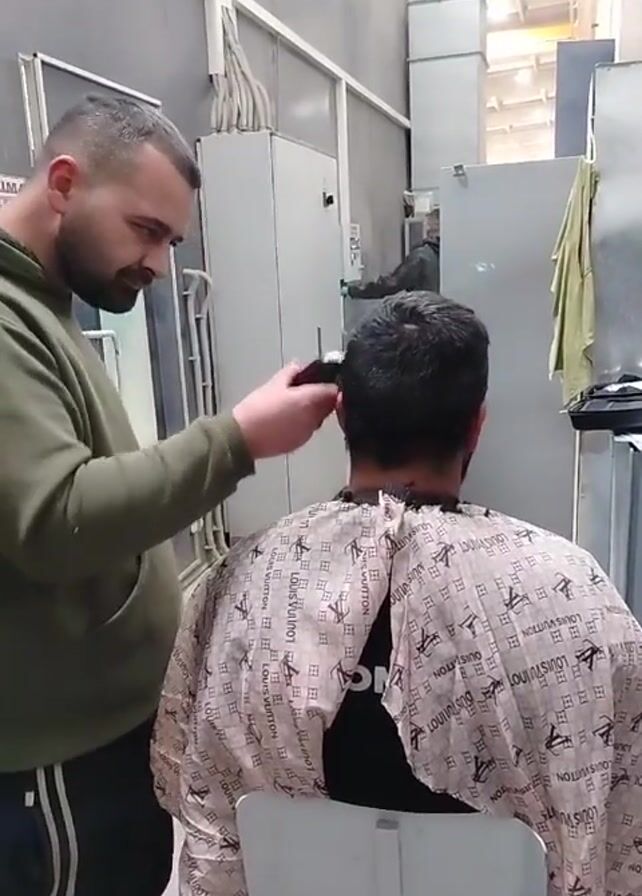 A man wearing an olive green hoodie and black pants with a white stripe down the side is giving another man a haircut. The barber is standing and facing the back of the man who is getting a haircut, who is seated in a white chair and wearing a cape with a light pink Louis Vuitton pattern. The barber is using an electric razor to trim the hair on the back of the seated man's head. There is a mirror in the background that shows the reflection of the man getting the haircut. The location appears to be a workshop or industrial space, due to the grey walls, white cabinets, and metal structures.