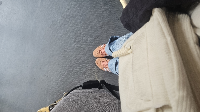 person's view from above, likely while seated. The person is wearing light blue jeans and pink Adidas sneakers with white stripes. A large, cream-colored, textured bag or shawl drapes across the person's lap. A black jacket or sweater is partially visible at the top of the frame. A grey seatbelt is buckled across the person's lap, and a small portion of a yellow object can be seen near the bottom left corner. The floor has a mottled grey texture.